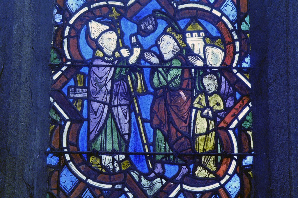 Verrière : maîtresse-vître, détail du panneau f3. 6e lancette, 3e registre : Saint Samson rencontre Privatus, seigneur de la région de Dol, sa femme atteinte de la lèpre et leur fille possédéeImmatriculation