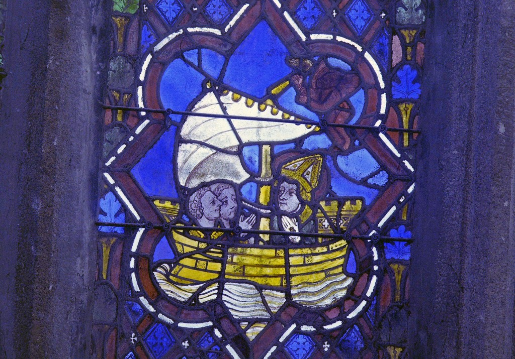 Détail du panneau f2. 6e lancette, 2e registre : Saint Samson franchit la Manche pour gagner l'ArmoriqueImmatriculation