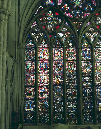 Verrière de la baie 100 (verrière légendaire) : Jugement dernier, Vie du Christ, Histoire d'Abraham, Vie de sainte Catherine, Vie de sainte Marguerite, évocation des évêques de Dol,