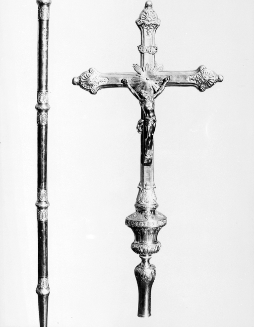 Croix de procession avec sa hampe, vue générale.Immatriculation