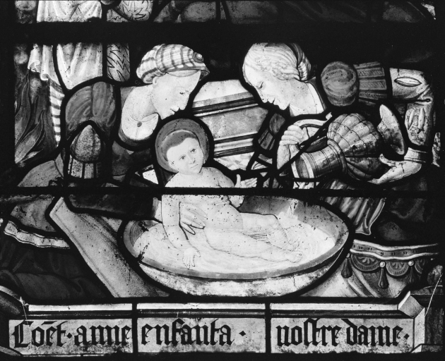 Maîtresse-vitre : Vie de la Vierge (baie 0) (La Ferrière fusionnée en Plémet en 2016),