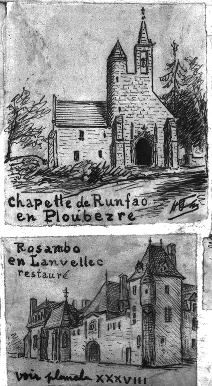 Dessin de Henri Frotier de la Messelière, vers 1930 : élévation est comprenant l'entrée à porte charretière, le pavillon nord-est, la chapelle et le chartrier dans l'angle sud-estImmatriculation