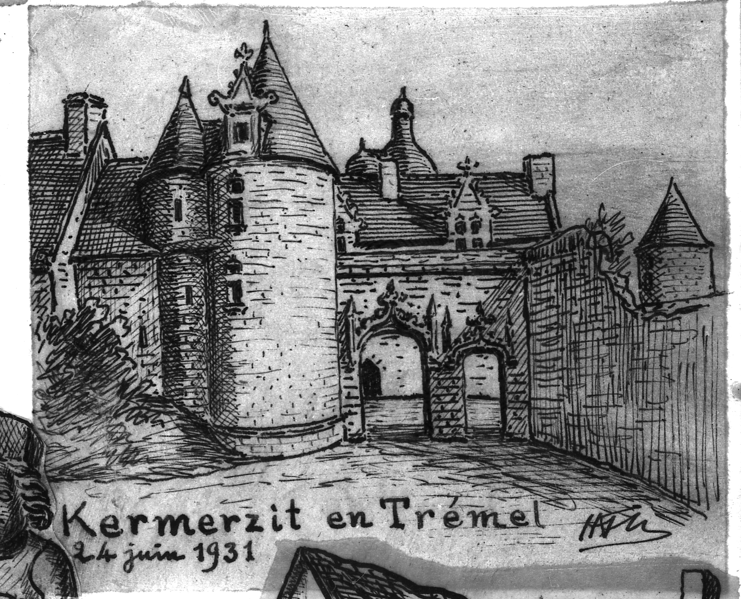 Trémel : manoir de Kermerzit, vue générale depuis le nord (portes piétonne et charretière de style Gothique), croquis par Henri Frotier de la Messelière, 24 juin 1931Immatriculation