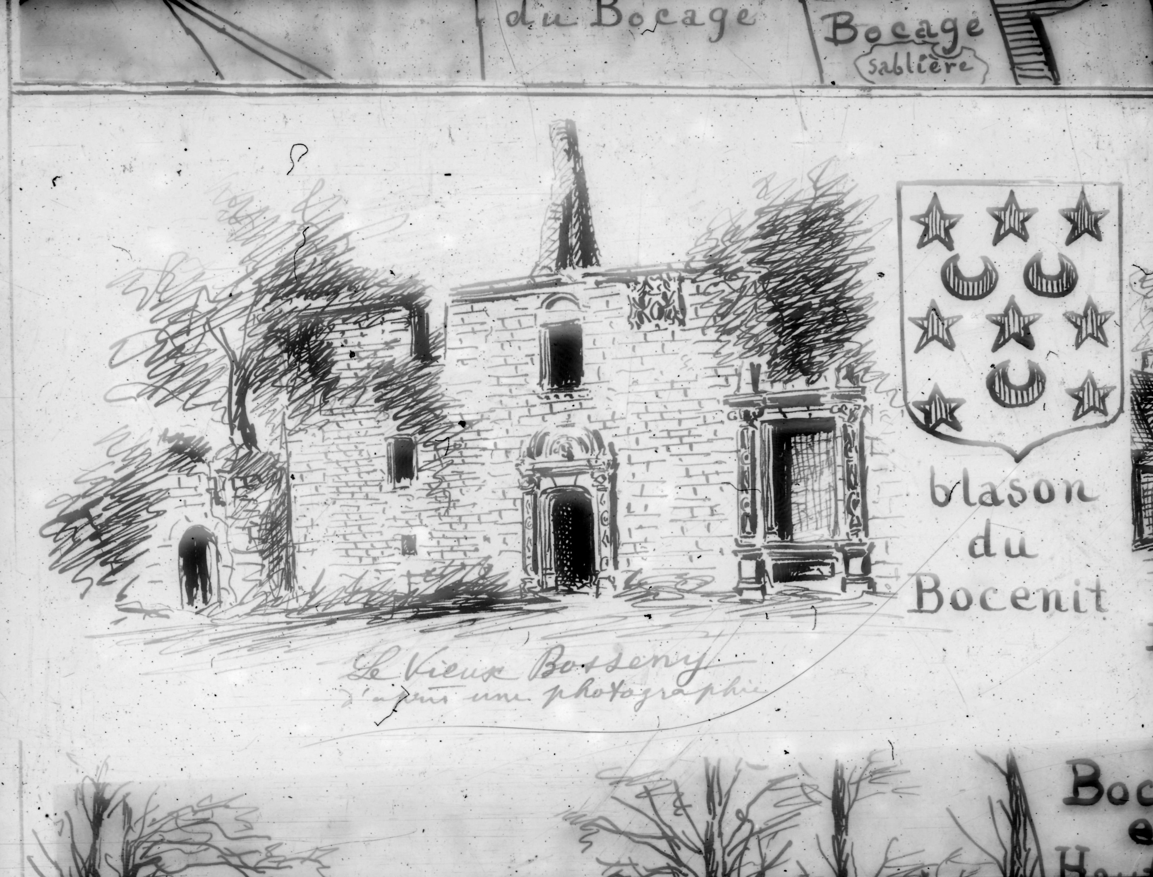 Le vieux manoir du Bocenit à Saint-Gilles-du-Mené, dessin d'Henri Frotier de La Messelière d'après une photographie, vers 1925. On reconnaît la porte d'entrée, la fenêtre de style Renaissance et les armoiries déplacés au Domaine de la Tour de CessonImmatriculation