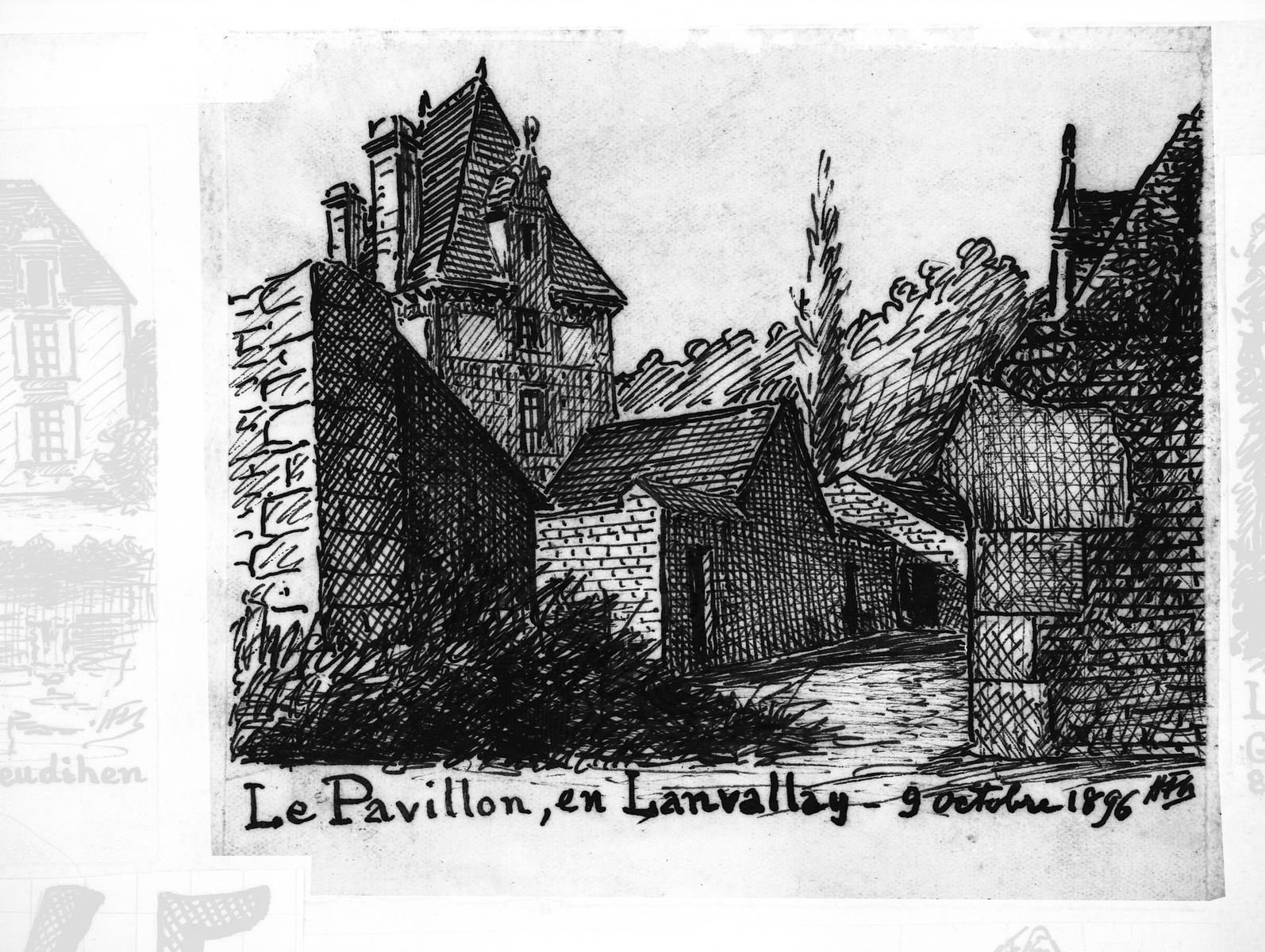 le Pavillon, 9 octobre 1896, dessin de Henri frotier de la Messelière, représentant un vestige du portail et la métairie, à droiteImmatriculation