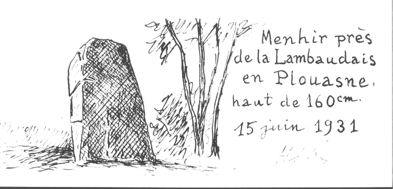 Croquis, Menhir près de la Lambaudais, 15 juin 1931.Immatriculation
