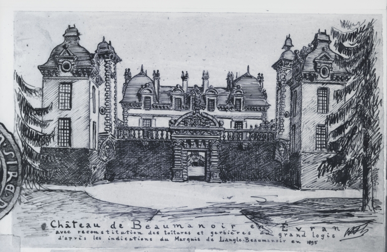 Croquis, château de Beaumanoir en Evran, avec reconstitution des toitures et des gerbières du grand logis d'après les indications du marquis de Langle-Beaumanoir en 1895.Immatriculation