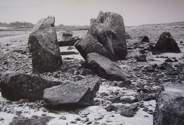Lanmodez, les restes de l'allée couverte de l'Île Coalen à marée basse, avril 1977 (cliché Guy Artur, pré-inventaire)Immatriculation