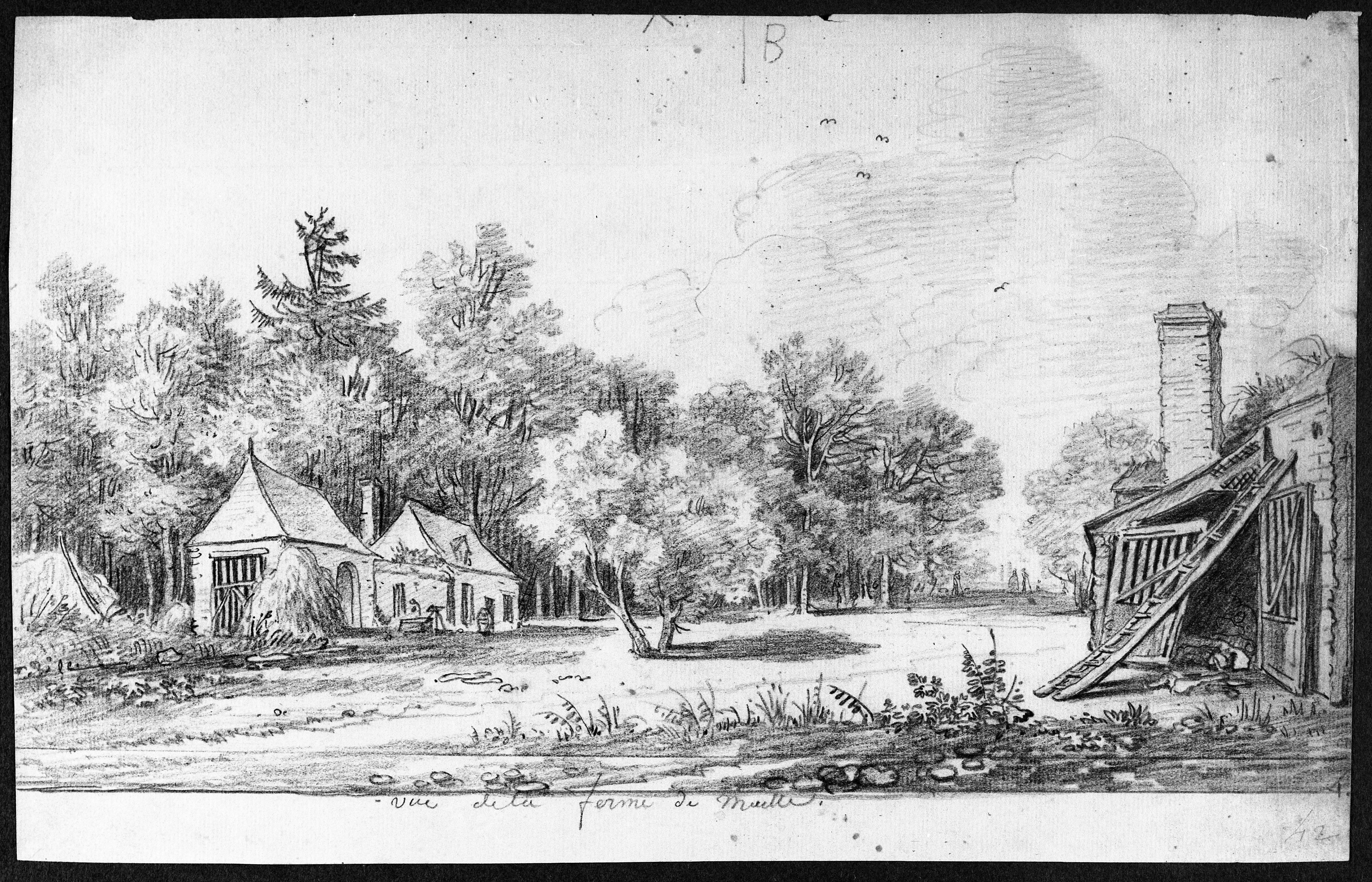 CASSAS, Louis-François. Vue de la ferme de Maillé. Dessin au crayon noir, 30 cm x 20 cm environ, 1776.