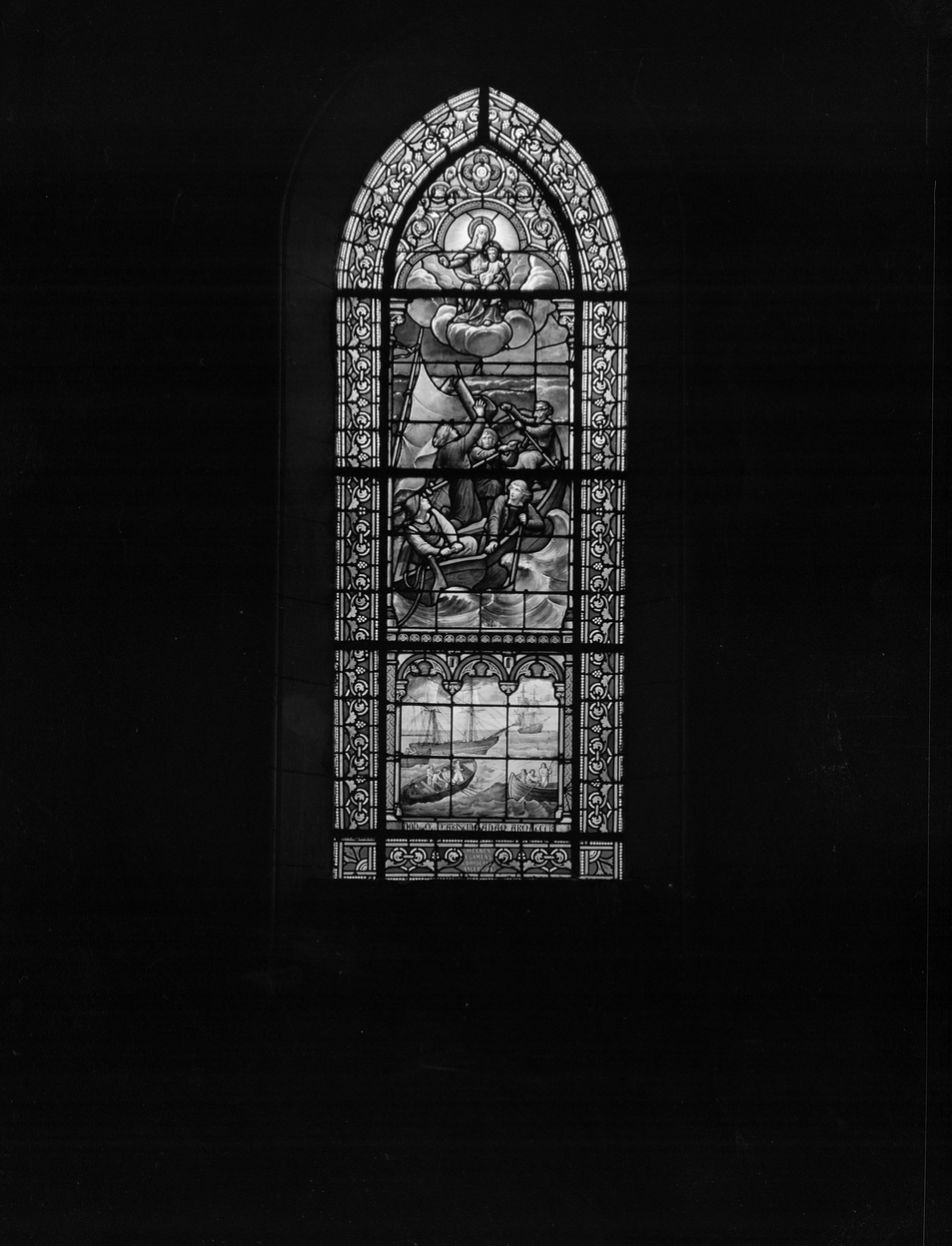 Verrière ex-voto de la baie 4 : Marins naufragés implorant la Vierge, église paroissiale Saint-Méen (Cancale),