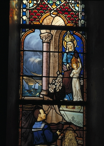 Verrière-ex-voto (?) de la baie 8 : Jeune marin offrant un maquette de bateau à la Vierge,