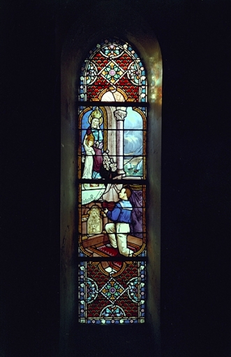 Verrière-ex-voto (?) de la baie 8 : Jeune marin offrant un maquette de bateau à la Vierge,