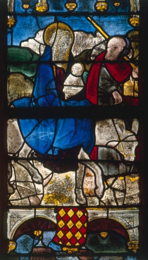 Verrière 1 : Vie de la Vierge, panneaux c2 et c3, Fuite en Egypte, vue générale.Immatriculation