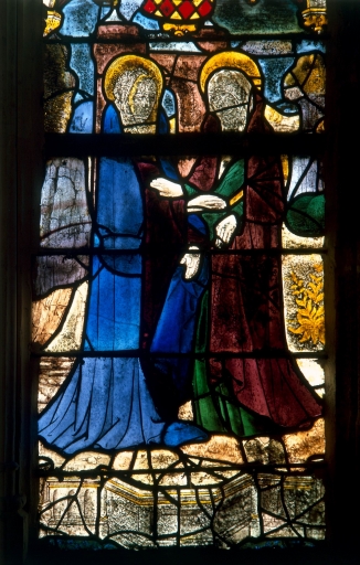 Verrière 1 : Vie de la Vierge, panneaux c1 et c2, Visitation, vue générale.Immatriculation