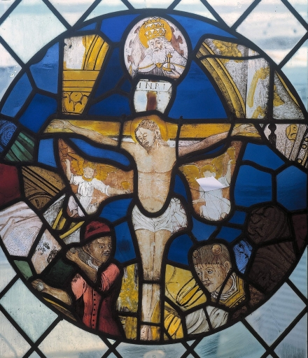 Verrière à personnages de la baie 1 : Christ en croix, Martyre de saint Etienne,