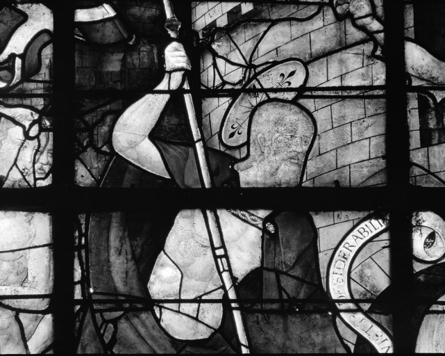 Verrière 3 : Descente aux limbes, buste et mains du Christ, vue de détail.Immatriculation