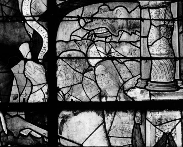 Verrière 3 : Descente aux limbes, groupe de personnages délivrés du démon, vue de détail.Immatriculation