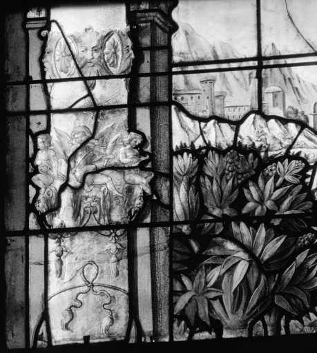 Baie 10 : Samaritaine au puits, vue de détail du décor, colonne de gauche.Immatriculation