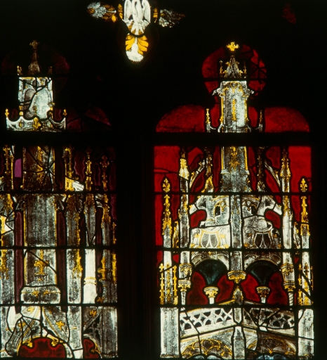 Verrière 1, vie de la Vierge, dais des panneaux b5, b6, c5 et c6.Immatriculation