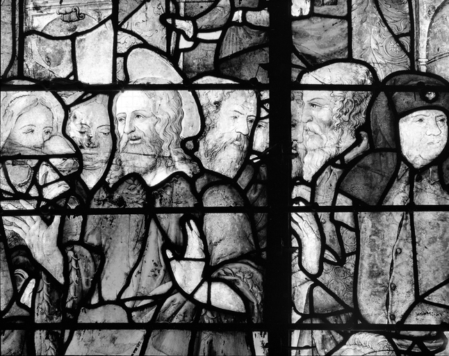 Mur nord, vitrail, la femme adultère, panneau A3 et B3.Immatriculation