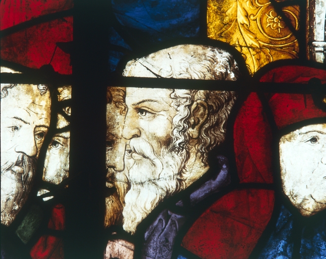 Mur nord, vitrail, la femme adultère : panneau B3, détail tête.Immatriculation