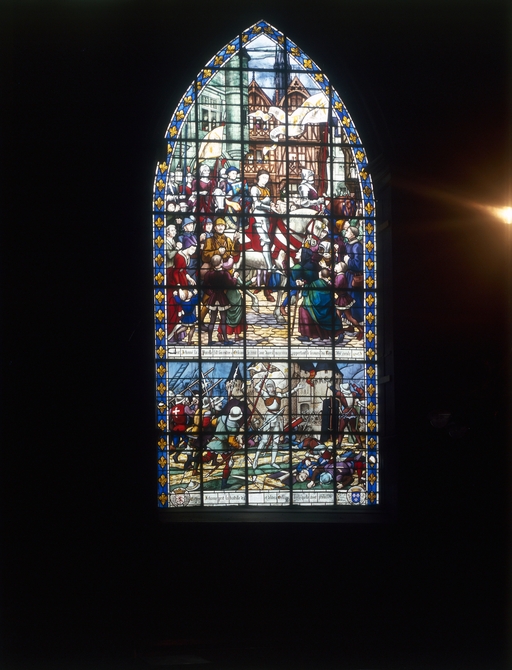 Verrière (9) : vie du Christ, Jeanne d'Arc délivrant Orléans, Apparition de la Vierge, sainte Anne et saint Joachim, saint Crépin et saint Crépinien, martyre de sainte Félicité, saint Michel, saint Gabriel, saint Raphaël (1 (2, 3, 4, 9) 1, 13, 14, 16), église paroissiale Saint-Sulpice (Fougères),