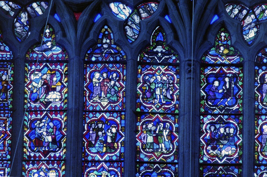 Verrière de la baie 100 (verrière légendaire) : Jugement dernier, Vie du Christ, Histoire d'Abraham, Vie de sainte Catherine, Vie de sainte Marguerite, évocation des évêques de Dol,