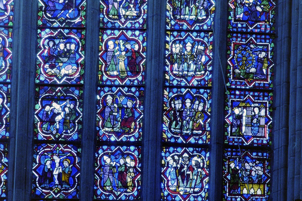 Verrière de la baie 100 (verrière légendaire) : Jugement dernier, Vie du Christ, Histoire d'Abraham, Vie de sainte Catherine, Vie de sainte Marguerite, évocation des évêques de Dol,