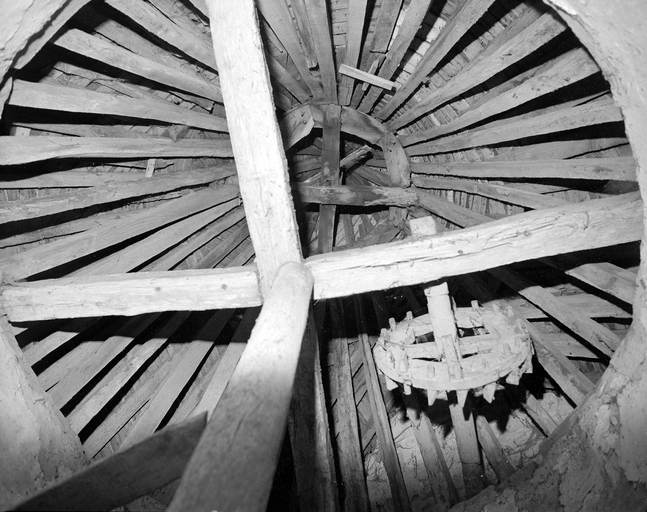 Vue de la charpente de la tour d'escalier.Immatriculation