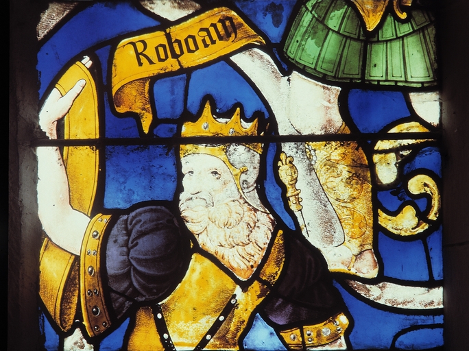 BEIGNON, église paroissiale Saint-Pierre, Verrière 1, panneau c3, Roboam, détail visage.Immatriculation
