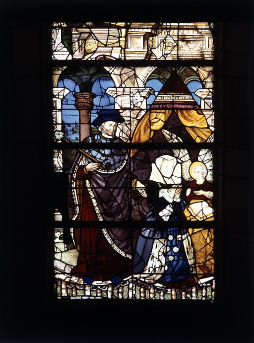 Verrière de la baie 19, panneaux 1b, 2b et 3b : Henriette de Kerveno, un ange et le roi saint Henri de Bamberg (état en 1980)Immatriculation