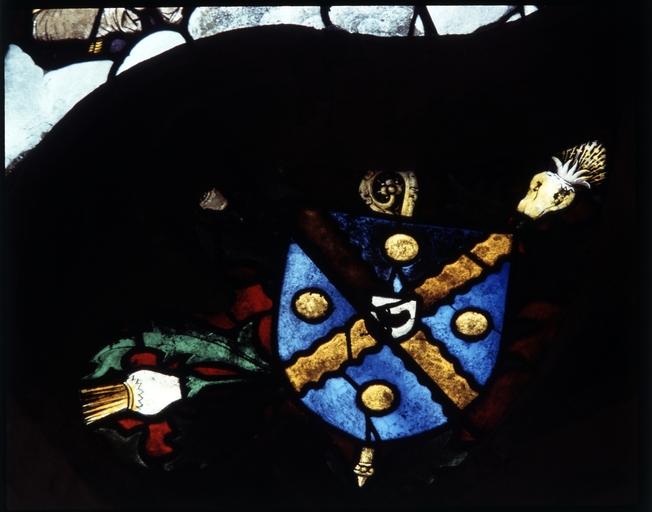 Verrière de la baie 5, réseau, écu portant les armoiries de la famille l'Épervier : d'azur, au sautoir engrêlé d'or, cantonné de quatre besants de même (état en 1980)Immatriculation