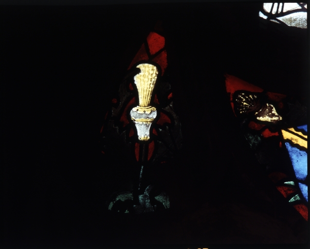 Verrière de la baie 5 : Vierge à l'Enfant, Saint Michel terrassant le dragon et Jean de l'Épervier, donateur, présenté par saint Pierre, église Saint-Armel (Ploërmel),
