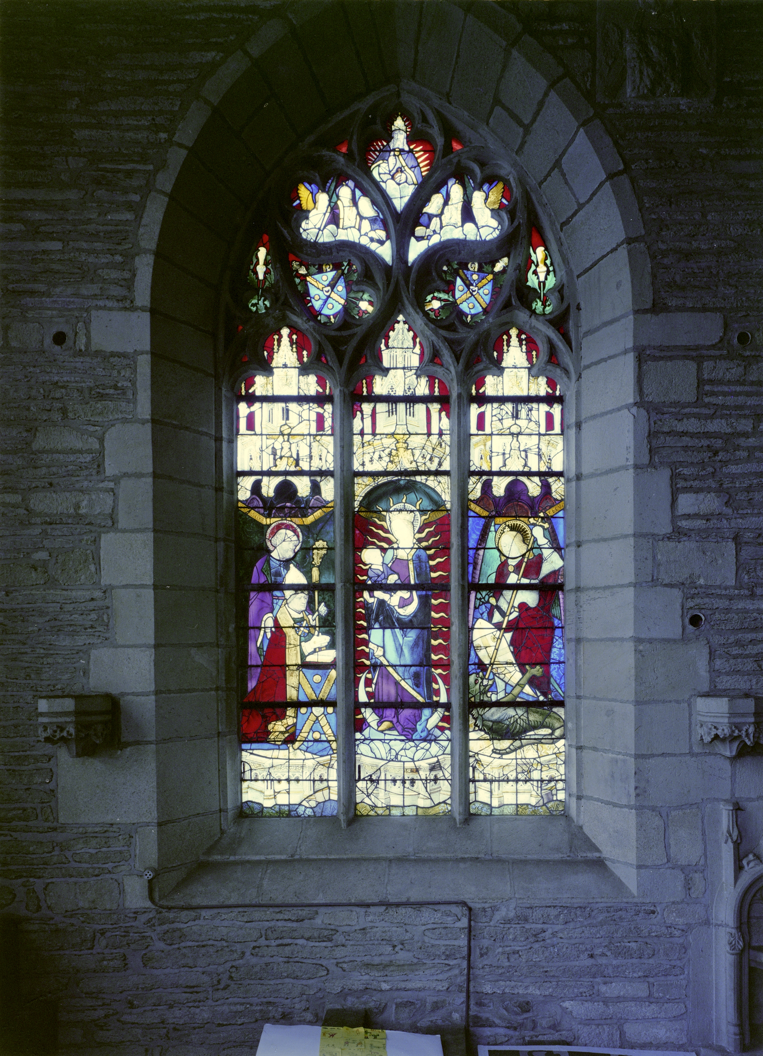 Verrière de la baie 5 : Vierge à l'Enfant, Saint Michel et Jean de l'Épervier présenté par saint Pierre (état en 1980)Immatriculation