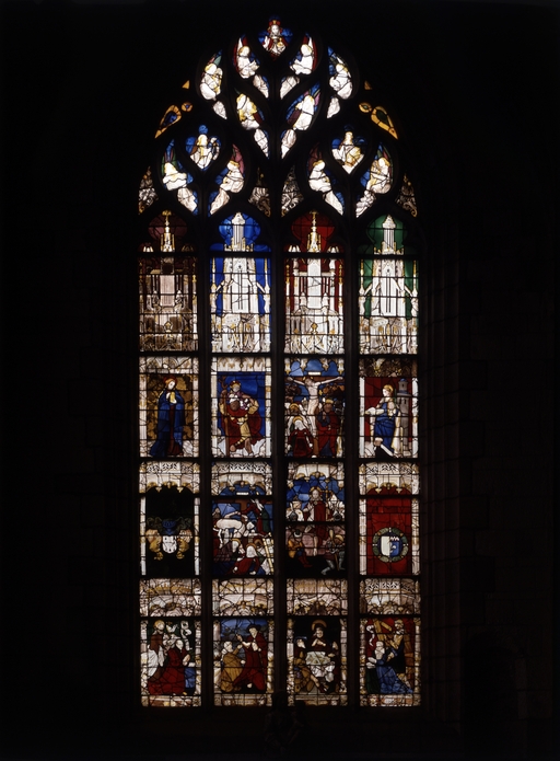 Verrière de la baie 1 : Passion du Christ, Saint Jean-Baptiste avec Jean Rogier, Sainte Hélène avec Hélène Josse, Saint Christophe, Sainte Marie-Madeleine, Sainte Barbe, église Saint-Armel (Ploërmel),
