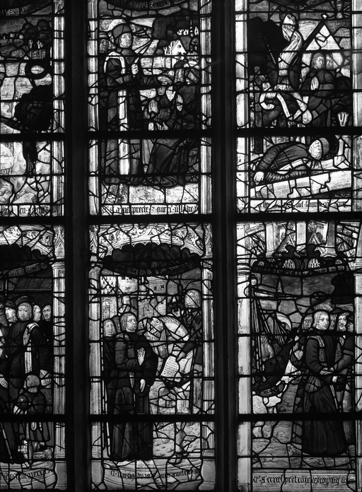 Verrière , Vie de saint Armel, panneaux c1 et d1 : Armel rencontre les envoyés du roi et quitte ses compagnons ; panneaux c2 et d2 : il prêche et guérit un pauvre labre et meurt après l'annonce de l'ange (état en 1980)Immatriculation