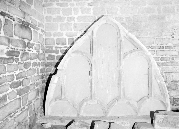 Remplage de la baie du chevet déposé dans la nef.Immatriculation