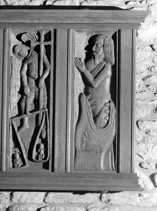 Bas-relief (3) : la Pesée des âmes, la Résurrection des morts, le Supplice de l'arbre sec, église paroissiale Saint-Tugdual (Grand-Champ),