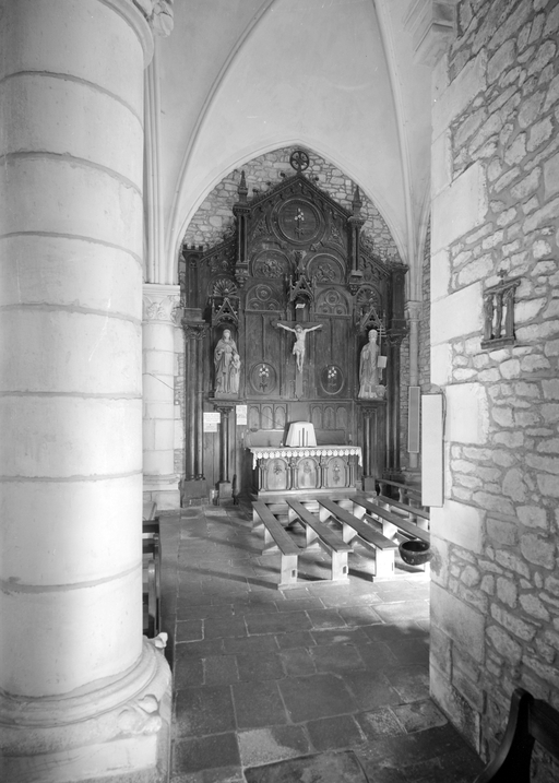 Autel, retable, statue (2), groupe sculpté (autel secondaire, autel tombeau, retable cadre) : Education de la Vierge, saint Cornély, Christ en croix, style néo-roman, église paroissiale Saint-Tugdual (Grand-Champ),