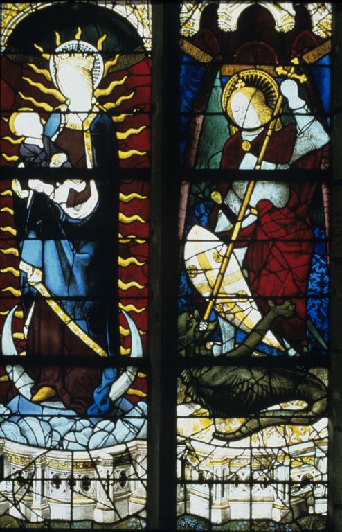 Verrière de la baie 5, panneaux b2-3 : Vierge et Enfant et panneaux c2-3 : saint Michel et le dragon (état en 1980)Immatriculation