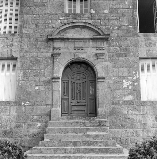Logis des années 1930, élévation antérieure sud, détail de la porte d'entrée réemployée. (1984)Immatriculation