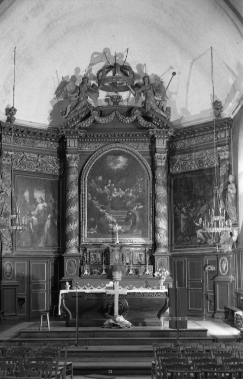Retable (3), tableau (5, maître-autel, autel secondaire, retable architecturé) : la Pentecôte, Remise des clefs à saint-Pierre, la Cène, Trinité avec saint Roch et saint Sébastien, Donation du rosaire, église paroissiale Saint-Pierre (Retiers),
