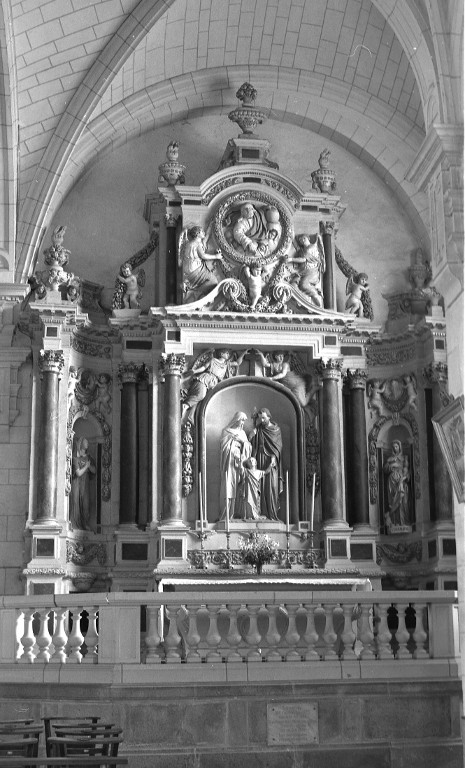 Retable, autel, groupe sculpté, haut-relief, statue (2, autel secondaire, retable architecturé) : sainte Christine, sainte Germaine, sainte Famille, église paroissiale Saint-Pierre (Coësmes),