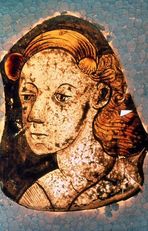 Verrière : tête de femme, église dite Chapelle Saint-Nicolas, le Binio (Augan),
