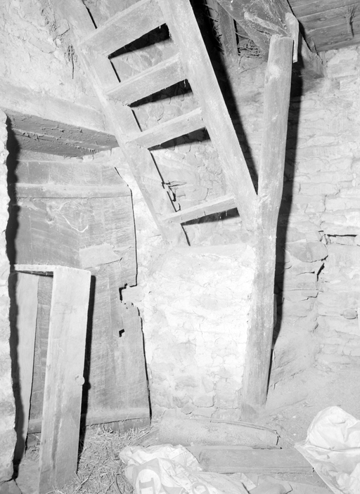 Etage, escalier en vis (vestiges), (traces d'arrachement du mur de la tourelle d'escalier à droite.Immatriculation