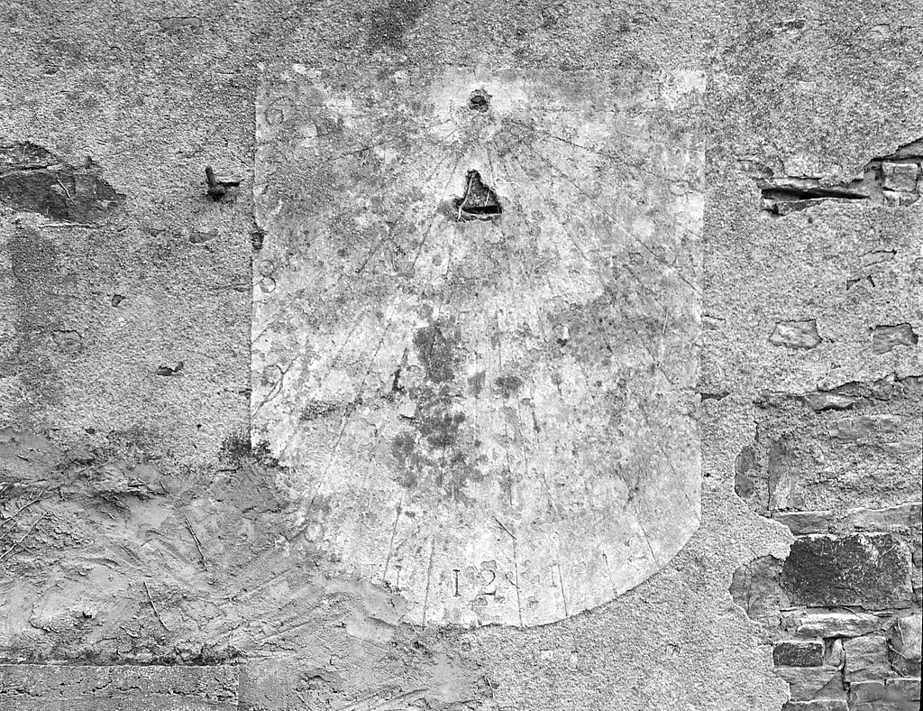 Elévation postérieure sud : cadran solaire enduitImmatriculation