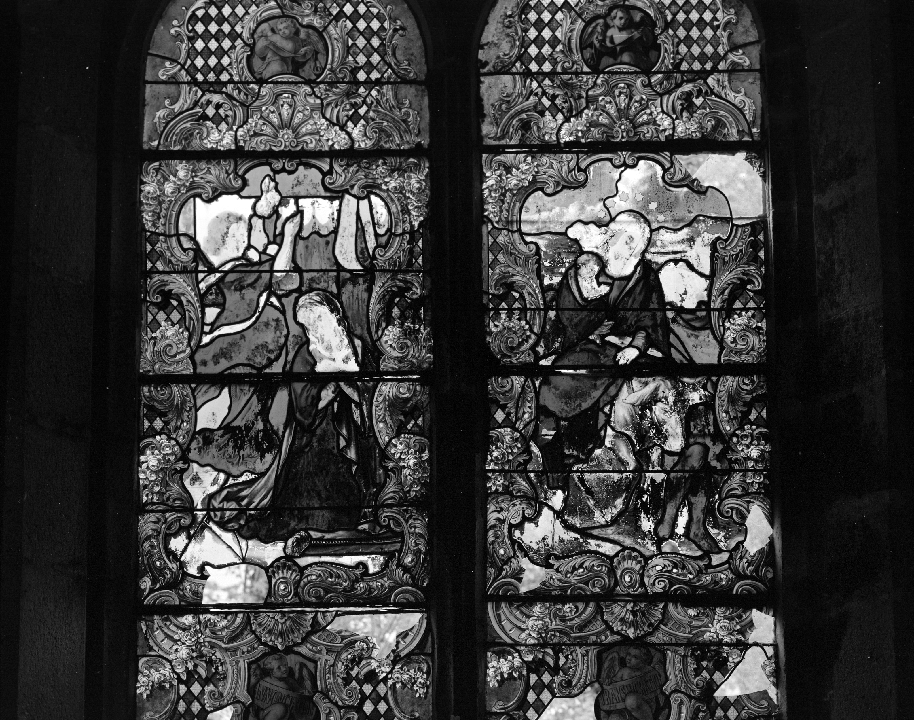 Chapelle, vitrail, détail.Immatriculation