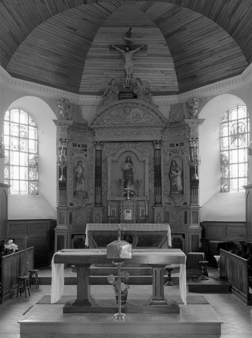 Autel, retable, tabernacle, statue (2), croix, groupe sculpté (maître-autel, autel tombeau, retable architecturé, tabernacle à ailes) : Sacré-Cœur, sainte Anne et la vierge, saint Jean-Baptiste, christ en croix, église paroissiale Saint-Jean-Baptiste (Lalleu),