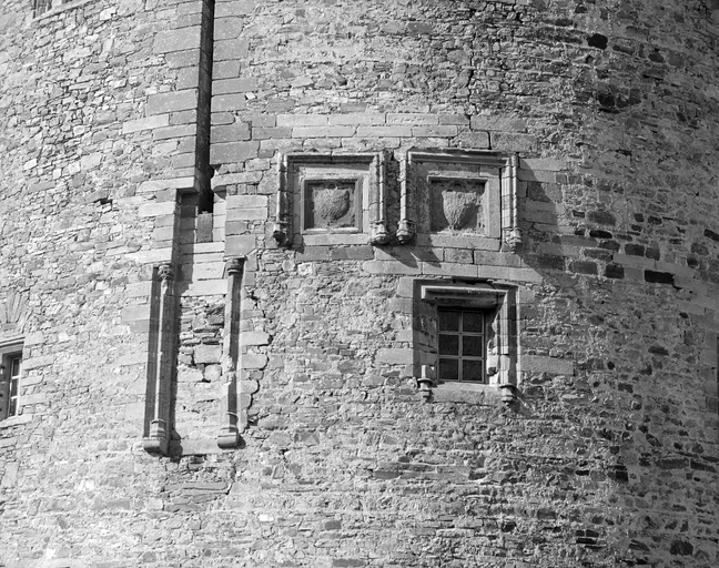 Le donjon, face sud-est, baies et blasons, vue générale.Immatriculation