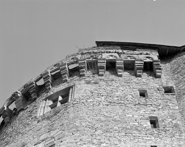 Le donjon, machicoulis, vue générale.Immatriculation